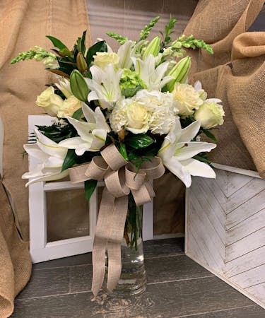 Striking white blooms such as lilies, roses, hydrangeas, and more make this hand-crafted arrangement the talk of the town. Artistically designed in a modern vase, it's perfect for intimate gatherings and makes a beautiful centerpiece or hostess gift.