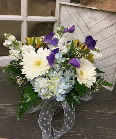 Voluminous baby-blue hydrangeas lay the foundation with their dreamy, cloud-like texture, while creamy white gerbera daisies open wide with sunny charm. Fragrant white stock and dainty waxflower add elegance and height, while golden alstroemeria and violet-hued blossoms provide a gentle burst of color and contrast. Finished with seasonal greenery and a sweet polka-dot ribbon, this design is as cheerful as a spring rain shower and just as refreshing.
